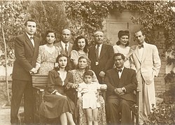 ایستاده از راست به چپ: حسینعلی و بدری (نوه)، آقا بزرگ ملاح (داماد)، مهلقا (نوه)، حسنعلی (پسر)، مهیندخت و خسرو (نوه)