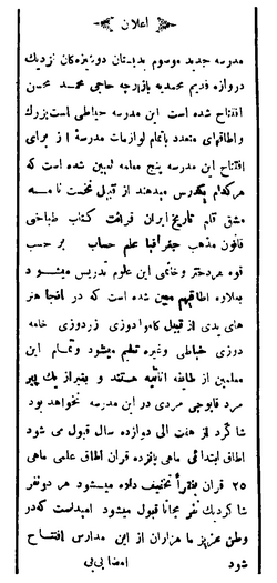 تصویر اعلامیهای که بیبی به امضای خود در روزنامه منتشر نمود و در آن دروس ارائه شده در مدرسه را معرفی کرد.